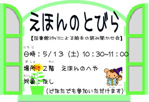 ゴールデンウィークはお天気の良い日が多かったですね。 みなさま、いかがおすごしでしたか? 図書館へもご来館ありがとうございました☆ 気がつけば、もう5月も2週目!第2土曜日13日は*えほんのとびら* があります。時間は10時30分から11時で、…