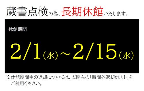 蔵書点検とは、図書館内のすべての資料を確認・点検する作業です。 ご理解ご協力よろしくお願いいたします。