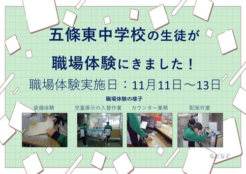職場体験生2名は、来館した方の貸出や返却、本を棚に戻す作業、 本にフィルムを貼るなど様々なお仕事を体験! 自分たちのおすすめ本の展示コーナーもつくりました! どんな感じになっているのでしょうか。 生徒が準備した展示コーナーは、1階新刊コーナー横…