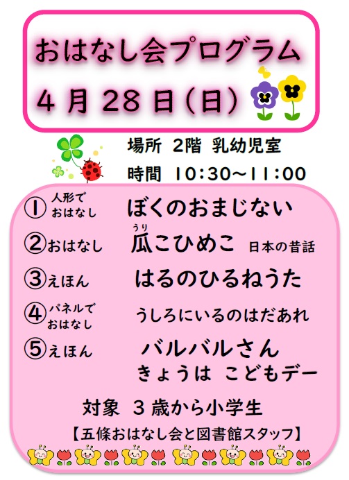 2024-04-18 24.4月の*おはなし会*のおしらせ えほんのとびら・おはなし会 4月 28日(日)10 時 30 分 〜 11 時 五條おはなし会さんと図書館スタッフによるおはなし会😊 当日、どんなおはなしをしてくれるのかな💓 みんなで”おはなしの世界”を楽しみましょう🌞