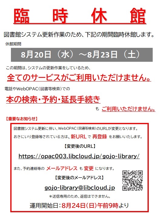 2025-08-02 図書館システム更新に伴う、臨時休館のお知らせ お知らせ また、8月15日(金)も図書館周辺が混雑するため、臨時休館します。 ご不便をおかけしますが、ご理解・ご協力よろしくお願い致します。